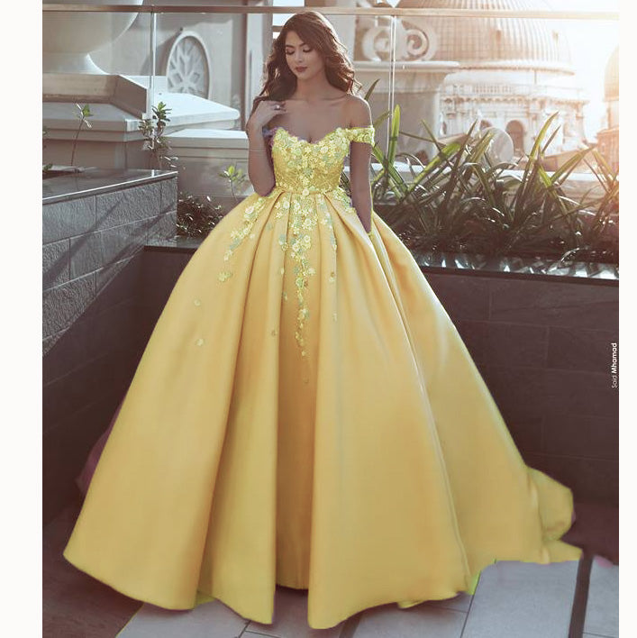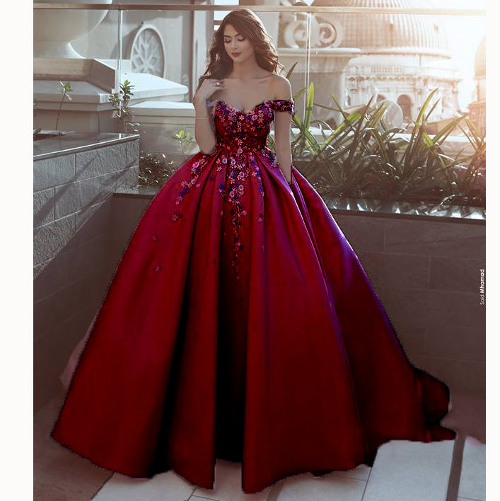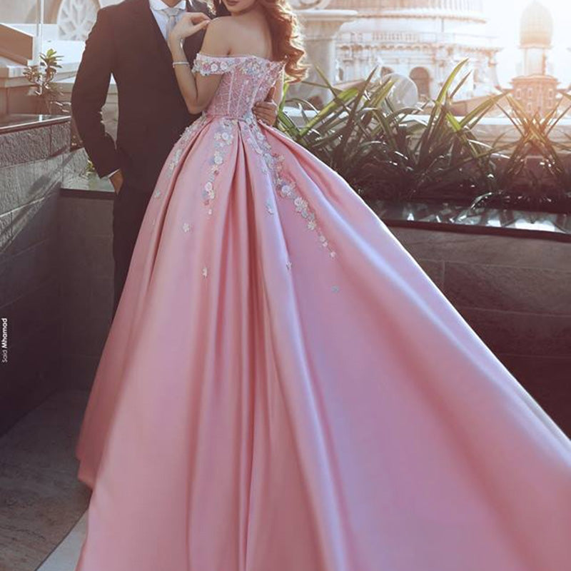 WD0211 Pink off the shoulder flower Ball Gown Prom Dress Appliques Lace Satin Wedding Dress Reception Gown