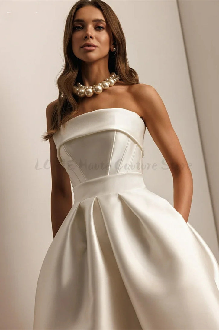 Strapless Sexy A Line Satin Ivory White Tea Length Short Wedding Dress