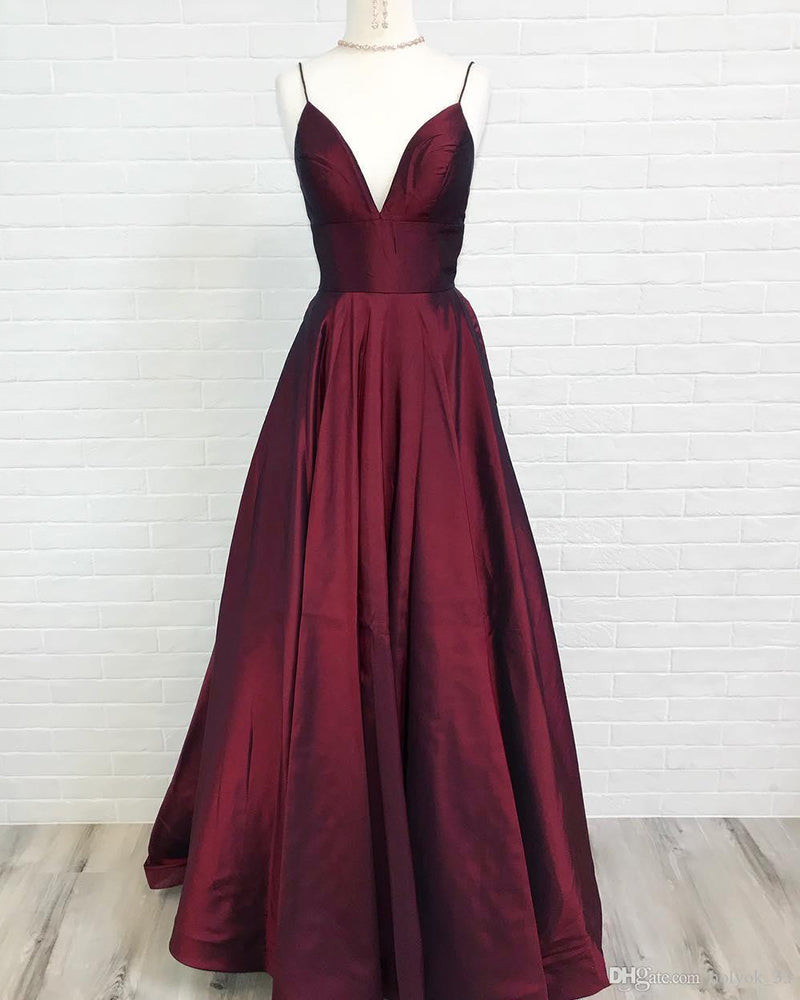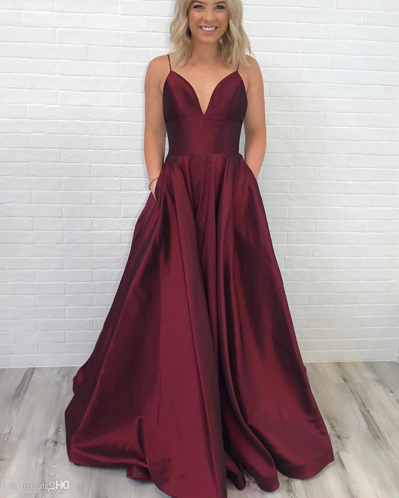 Burgundy Pocketed Basic Simple Prom Dresses Satin A Line Party Graduation Senior Gown with Straps PL10430