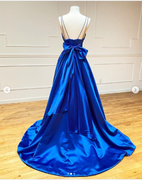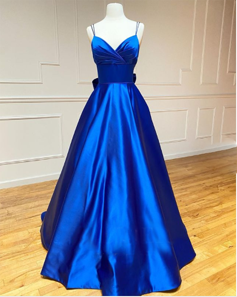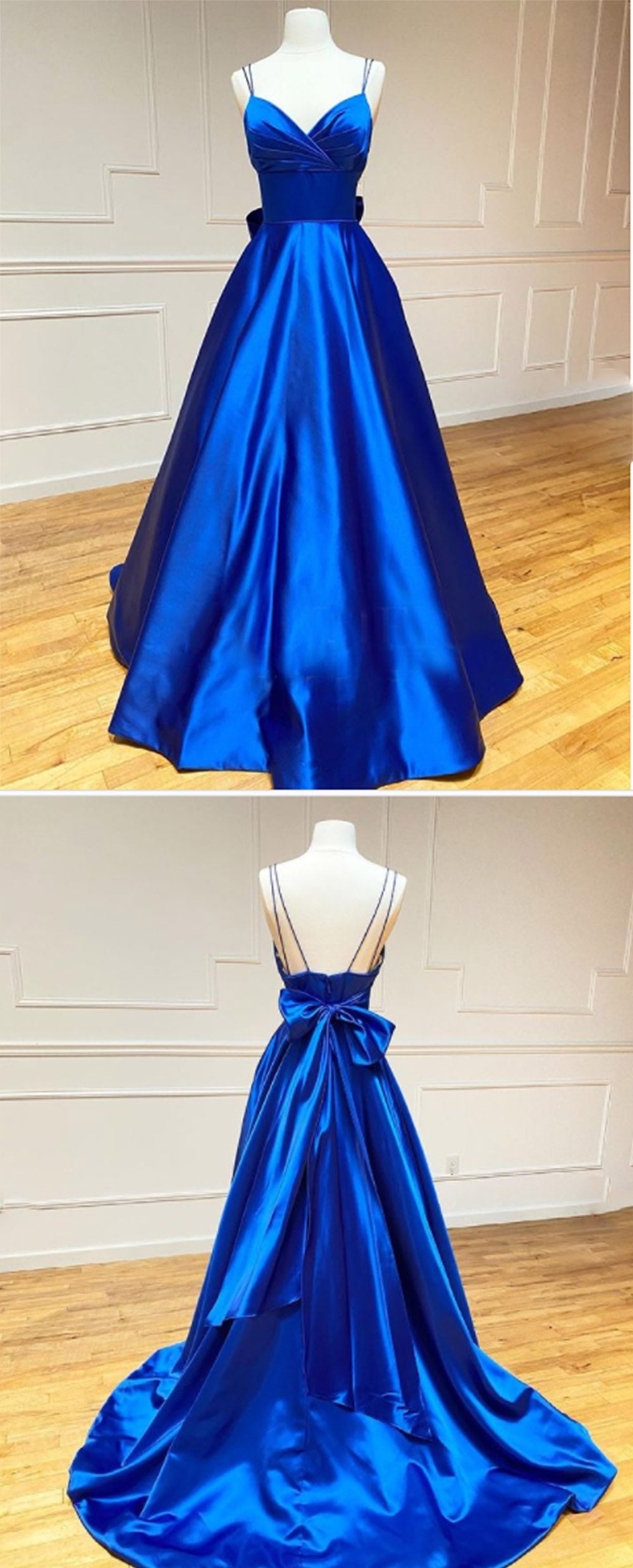 Elegant A Line Satin Royal Blue Prom Dress Long Evening Party Gown with Spaghetti Straps with Bow CB10824