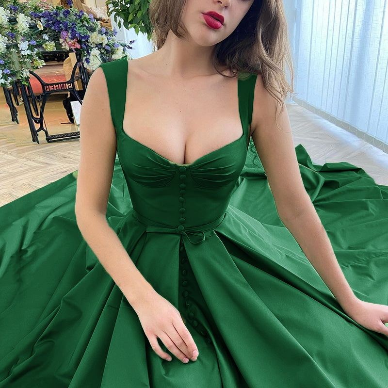 Emerald Green Satin A Line High Slit Prom Dress with Buttons Vestido De Novias Longo PL10611