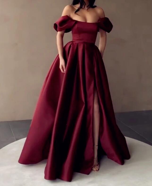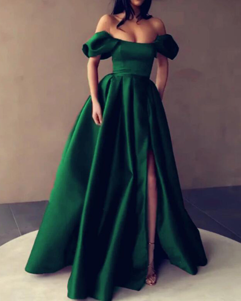 Satin A Line Emerald Green Poofy Short Sleeves Long Prom Evening Gown PL08042