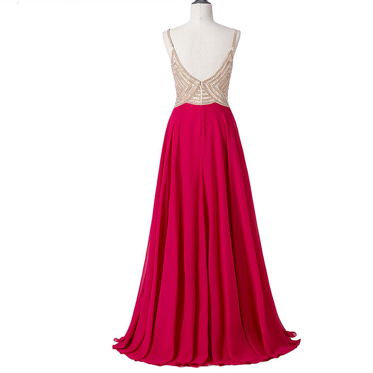 Red Long Beaded Prom Dresses with Straps A Line Chiffon Women Formal Evening Dresses 2018