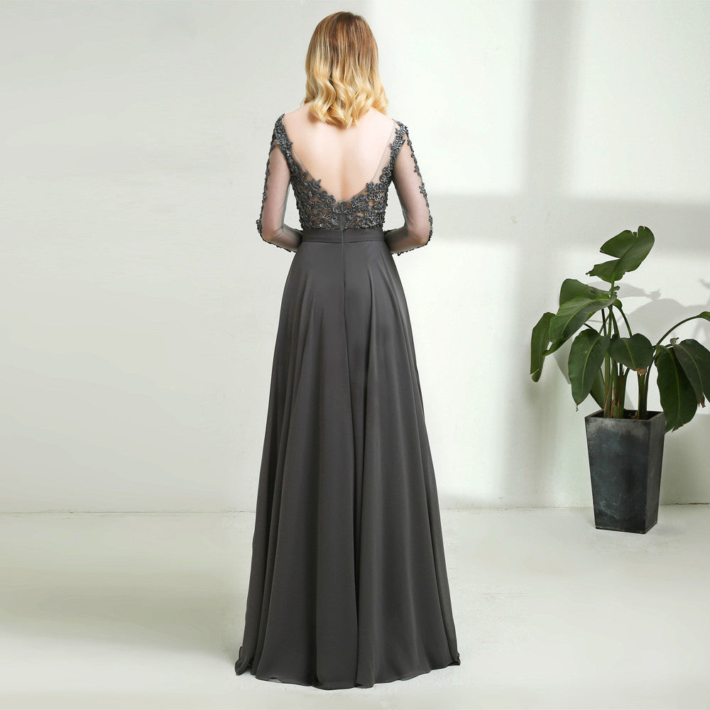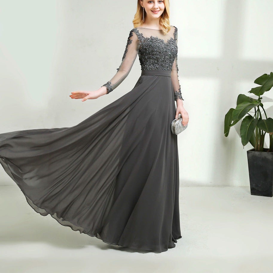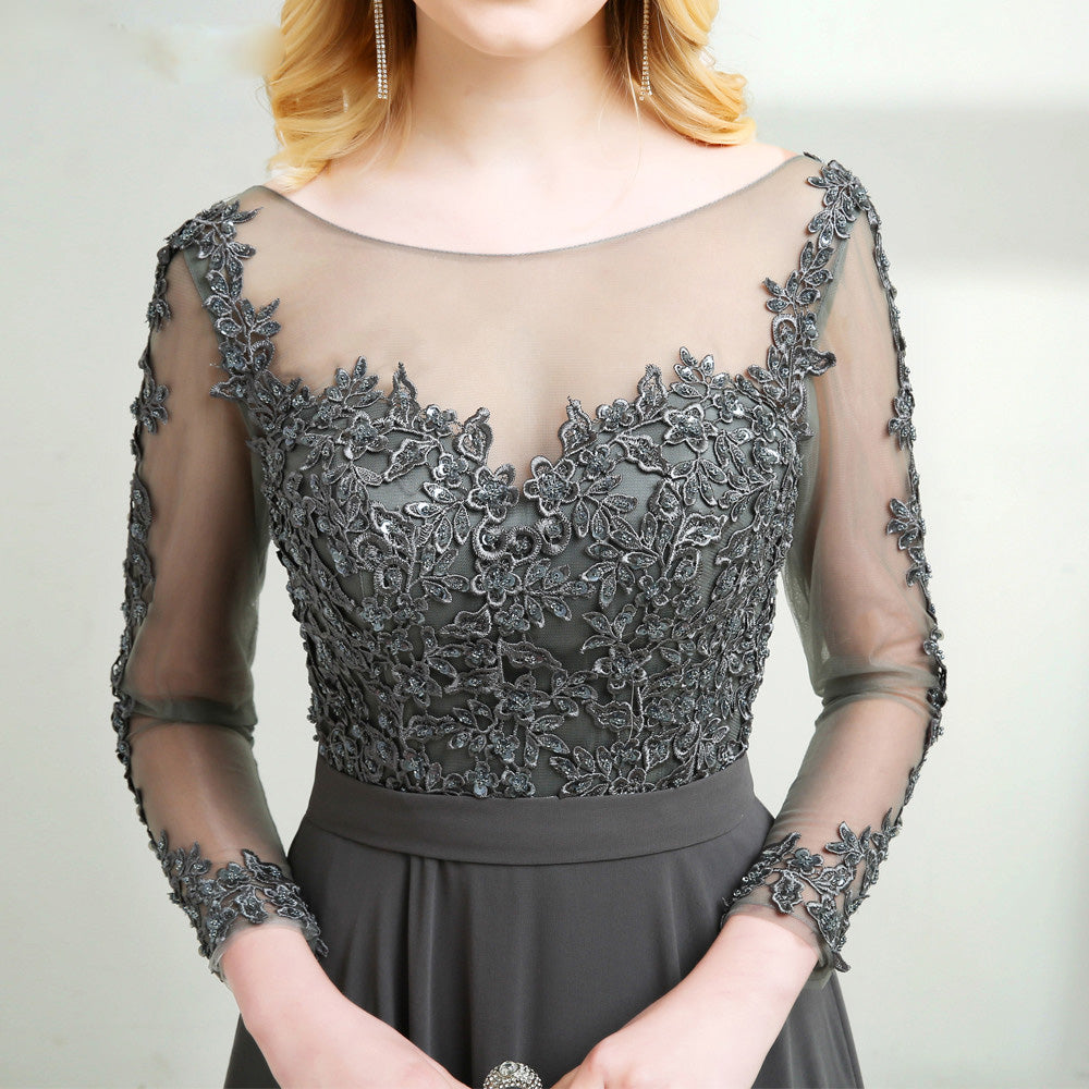 Elegant Long Sleeves Vintage Lace Chiffon Long Grey Mother of the Bride Dress 2020 with Long Sleeves