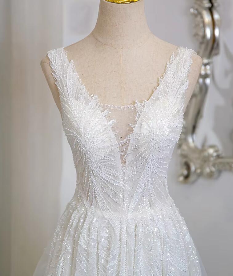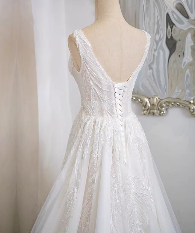 Fancy Ivory V Neck Beading Wedding Dress 2025 Lace Appliques Bridal Gown with Straps WS1213