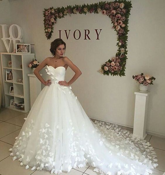 You will look and feel like a modern day princess in this butterfly ball gown dress . Classic sweetheart neckline is places along a bustier bodice. A tulle skirt Embellished with handmade butterflies showcases romance for the ultimate finish.