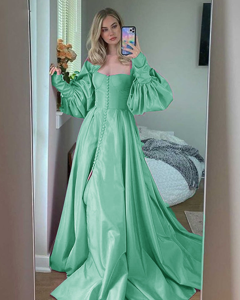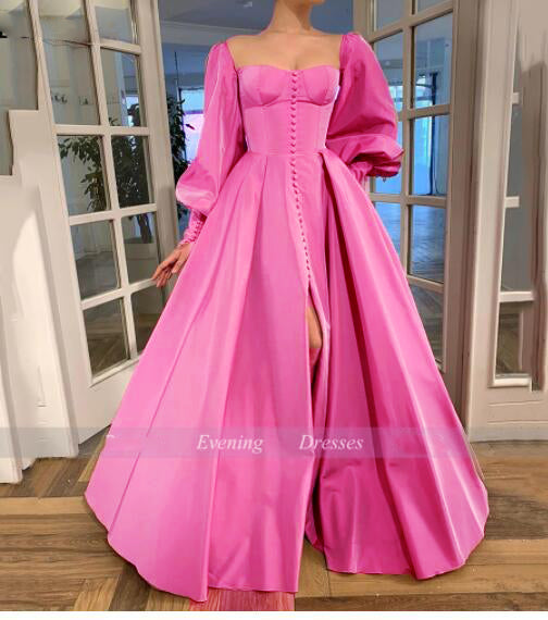 Princess A Line Satin Baby Blue /Pink Bishop Sleeves Prom Party Dresses with Slit Formal Gowns Buttons
