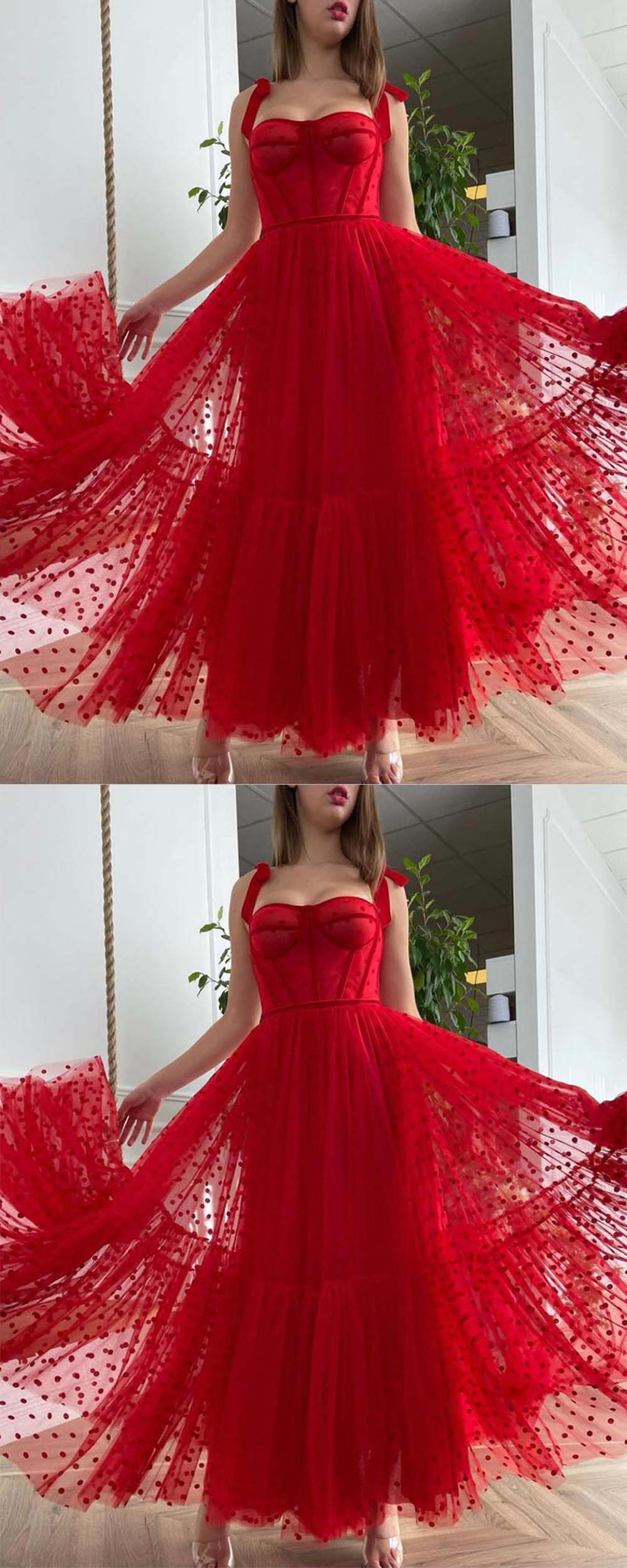 Red Polka Dots Tulle A Line Evening Dress Spaghetti Straps Tied Bow Shoulder Tea Length Party Graduation Prom Dress