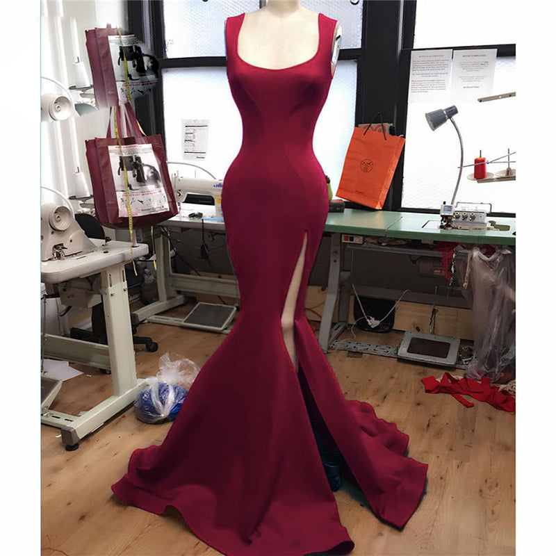 Red Scoop Neck Sexy Mermaid Prom Dress Split Leg , Women Evening Long Dress with Straps LP715