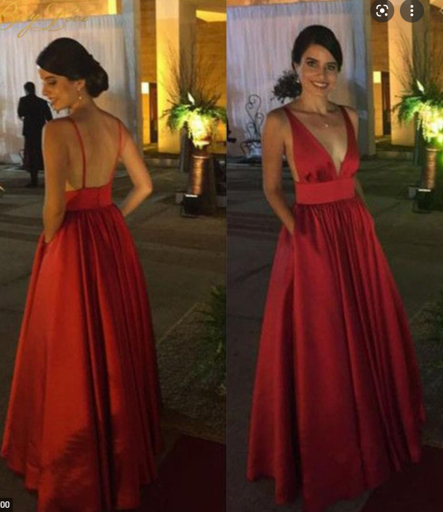 Red V Neck A Line Satin Long Evening Dresses with Pocket PL3302