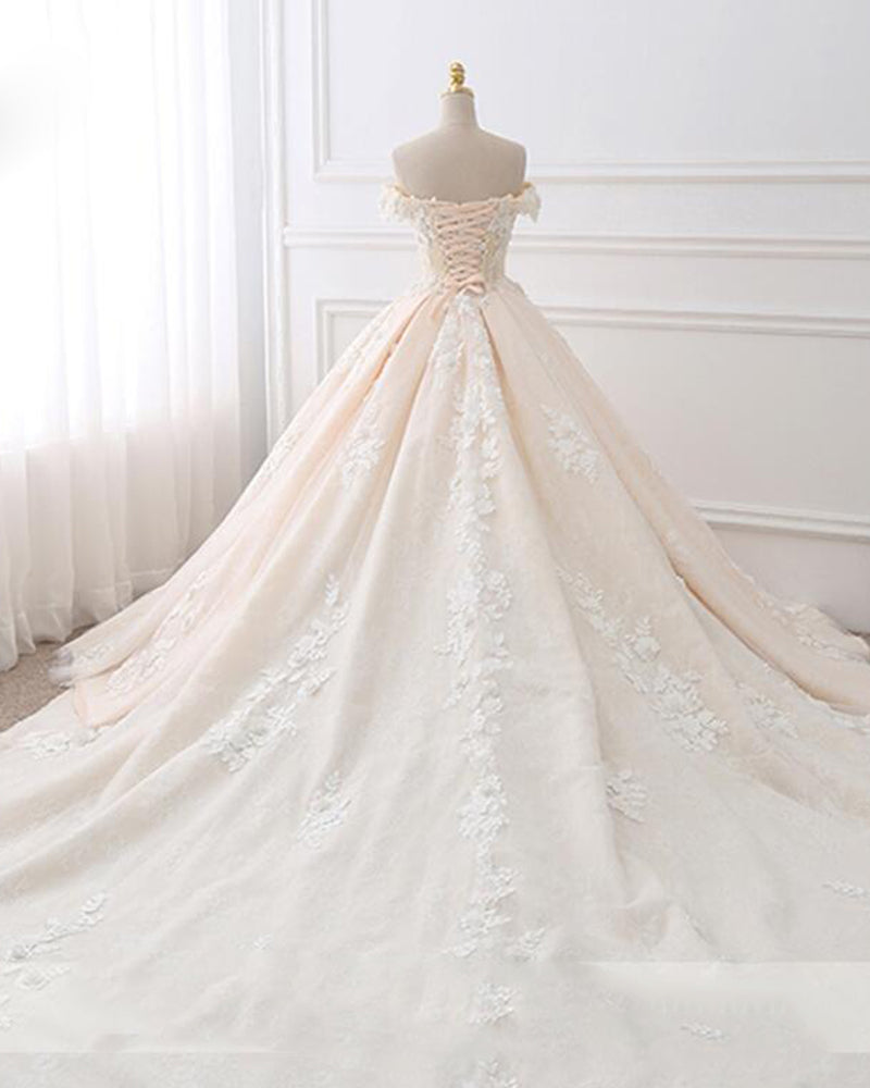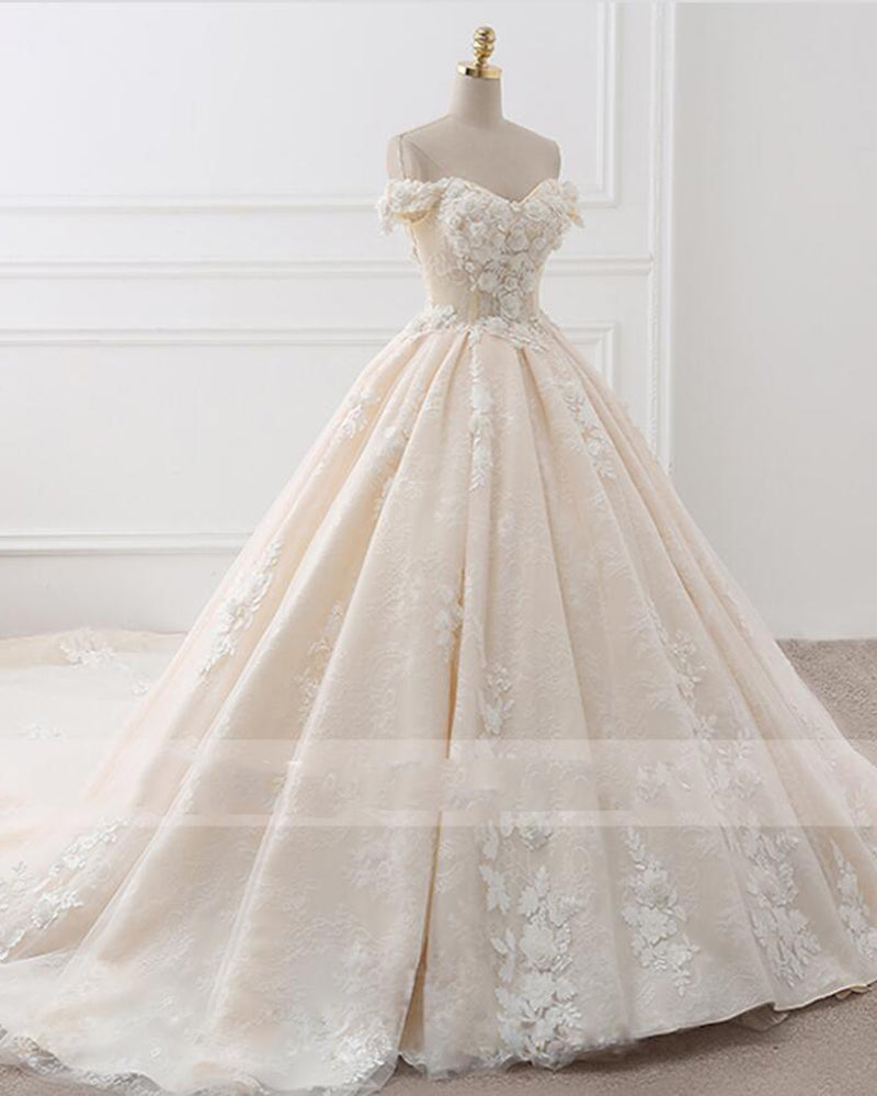 Romantic Off Shoulder Princesss Lace Ball Gown Wedding Dress 2021 with Flowers Robe De Mariee WD01123