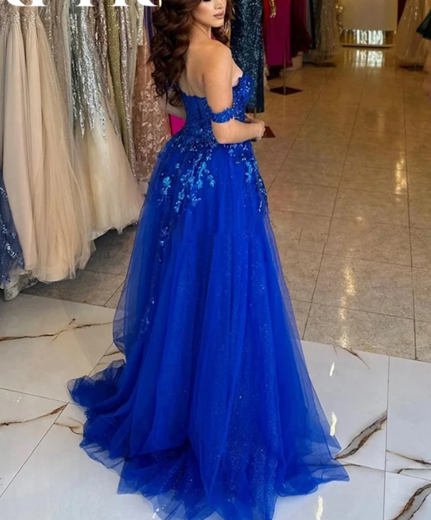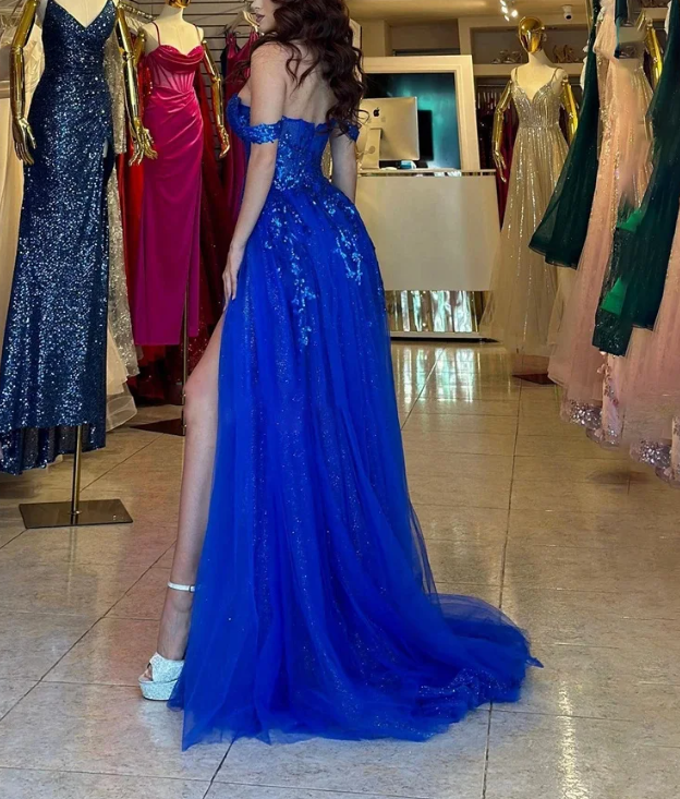 Royal Blue Prom Dresses Off The Shoulder Glitter Tulle Appliques Evening Dresses Sexy Side High Split Vestidos De Noche