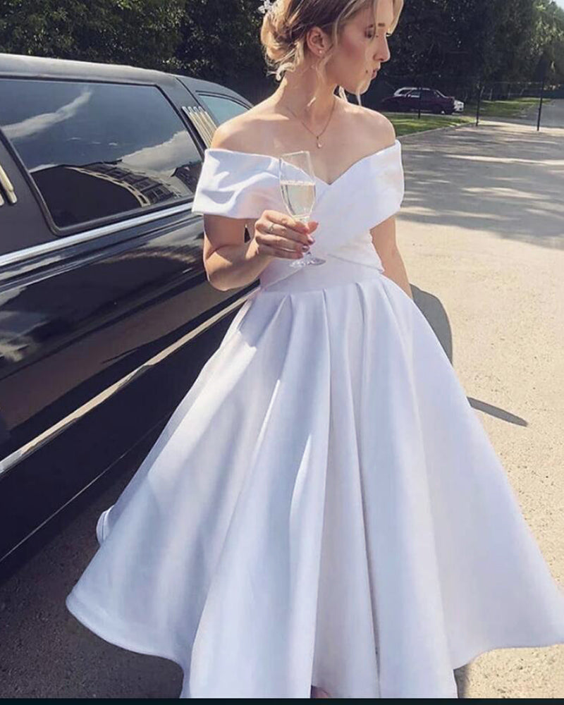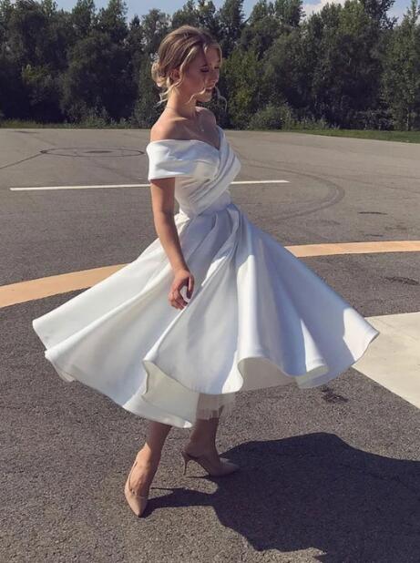 Satin A Line Off the shoulder Ivory/White Short Wedding Gown Party Dress Knee Length SP0815
