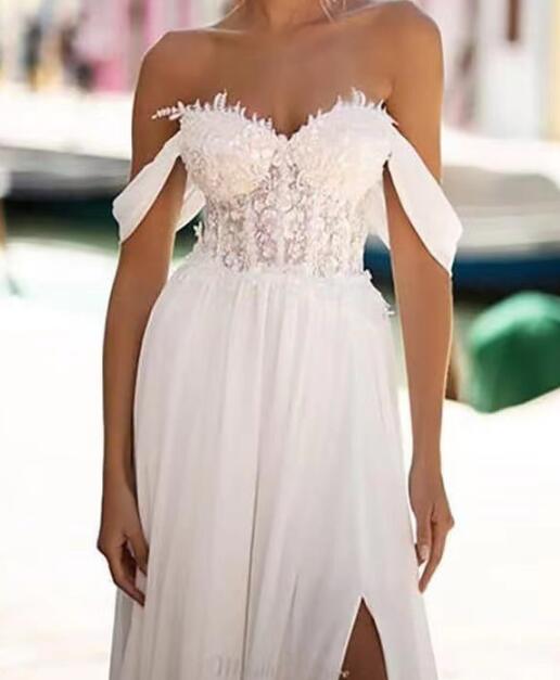 Sexy Slit Beach Wedding Dress Summer Off the Shoulder Lace White Bridal Gown