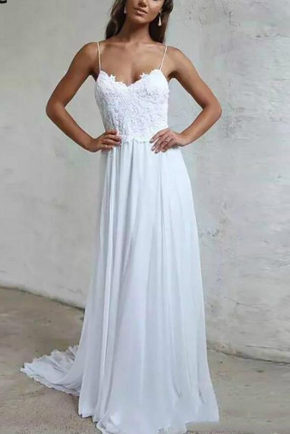 Soft and romantic, the A Line wedding dress features an intricately beaded and embroidered sweetheart neck, Lace bodice. A crystal beaded neckline and dainty spaghetti straps lead way to a gorgeous open back. The flowing A-Line Chiffon skirt with down to the floor.