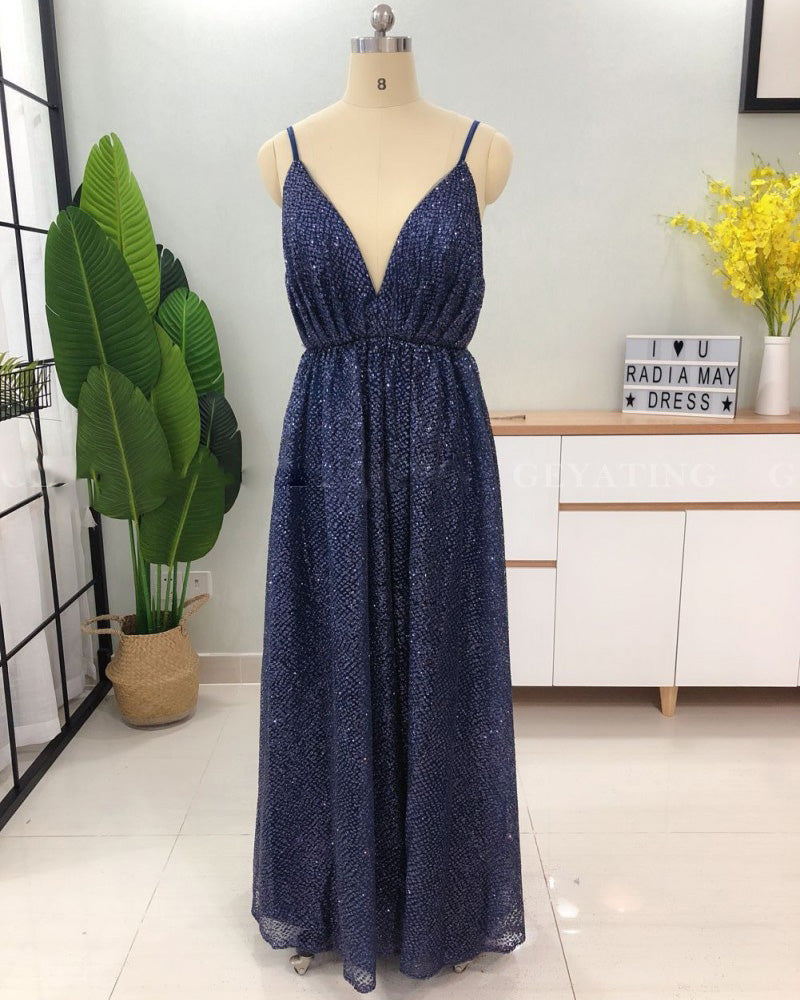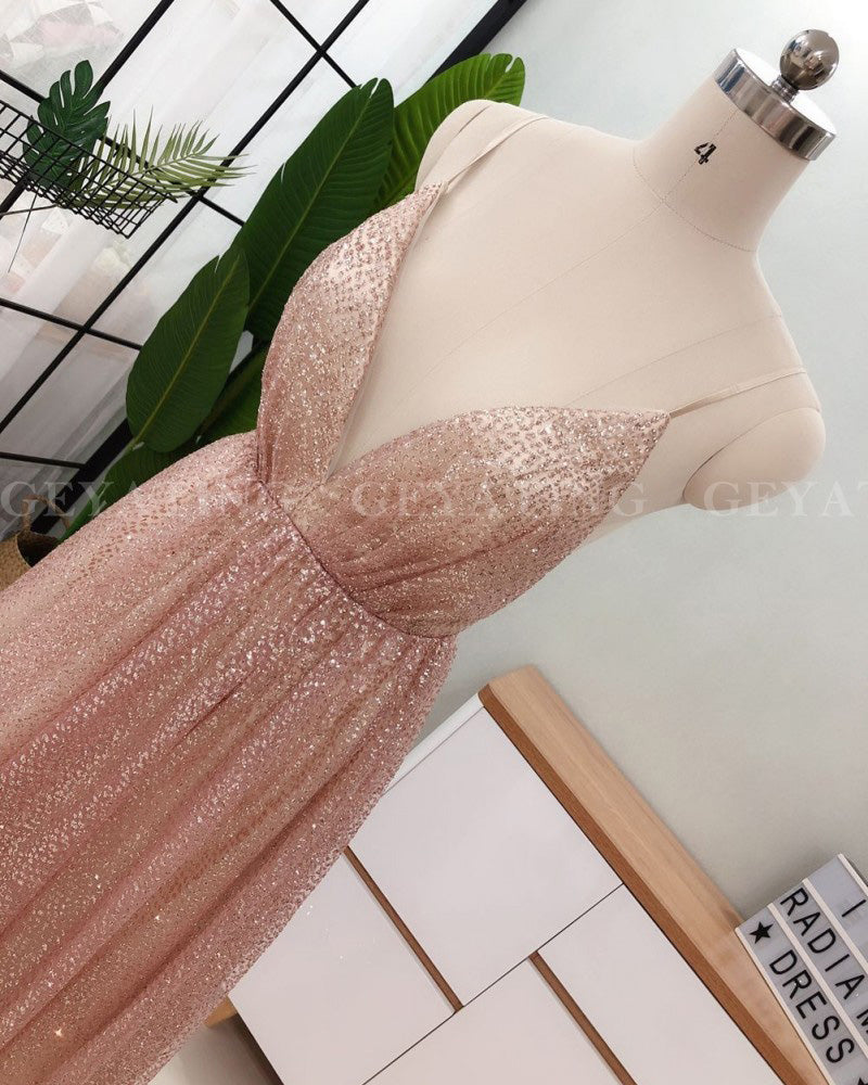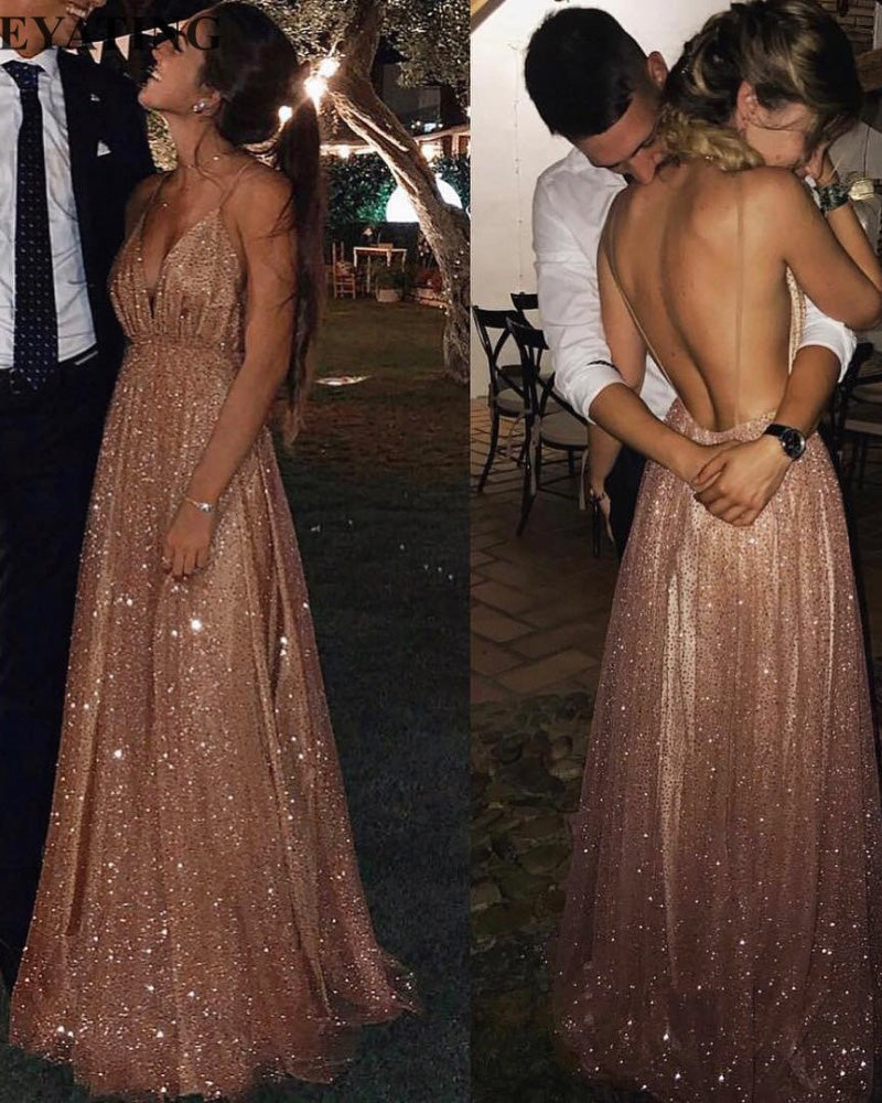 Siaoryne Rose Gold Bling Bling Women Sexy Backless Long Evening Gowns with Straps Sequins PL1211