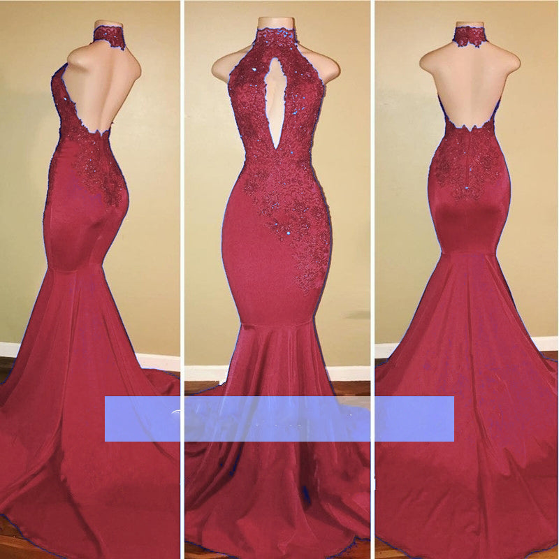 Red Mermaid Halter African Women Evening Gown Sexy Backless Prom Dress Lace abiti lunghi da sera 2018