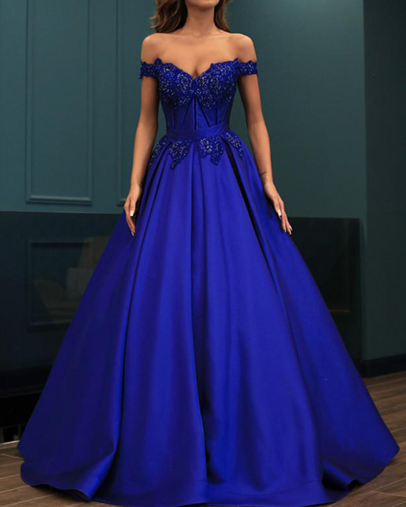 Royal Blue Satin lace Beaded Women Prom Evening Dress Engagement Formal Party Gown