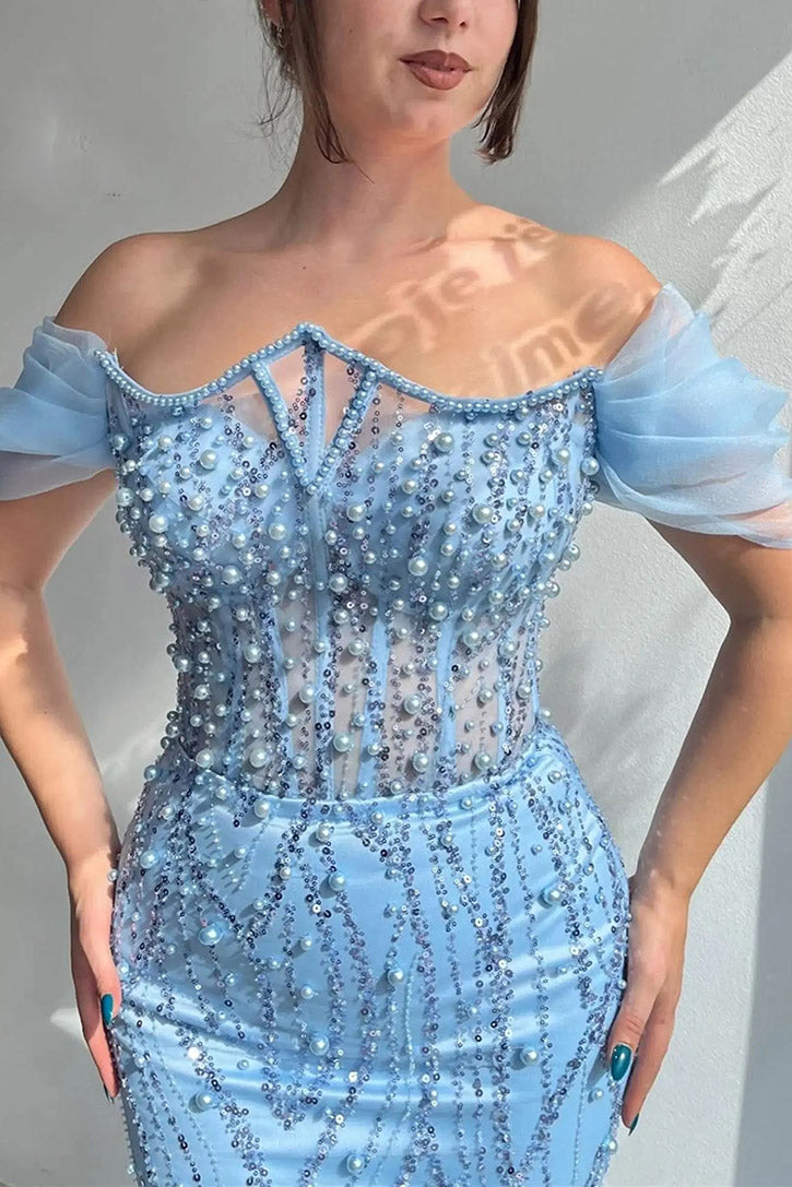 Sexy mermaid Off the Shoulder Baby Blue Beading Pearl Prom Formal Dress Long PL9111