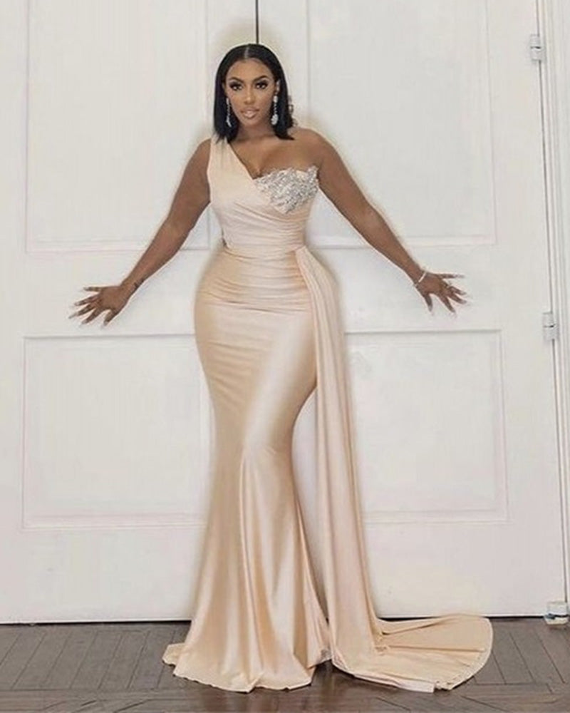 Sexy Mermaid Silk Satin One Shoulder Champagne/Light Pink Bridesmaid Dresses PL3118