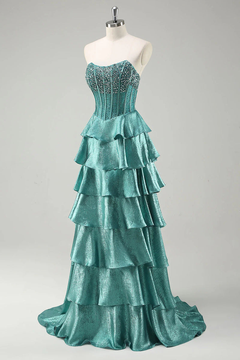 Sexy Sweetheart Corset Green Long Prom Dress with Beading Layered Evening Gown 2025 PL12206