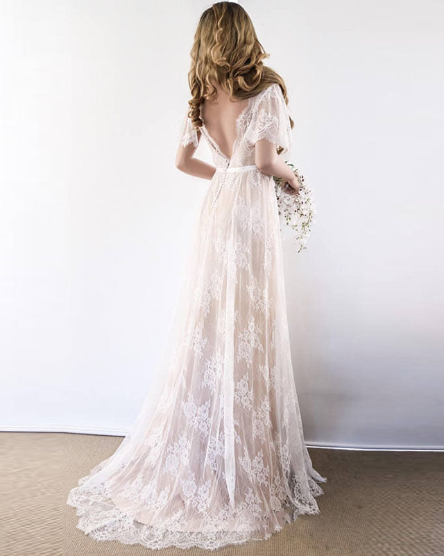 Short Sleeves Nude/ivory Beach Wedding Dress Lace Boho Bride Gown WD09012