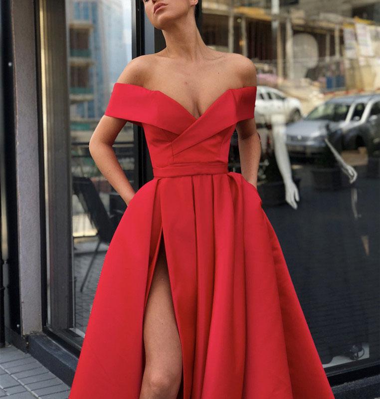 Siaoryne Burgundy Off Shoulder Prom Dresses Long with Slit Leg & Pockets PL142