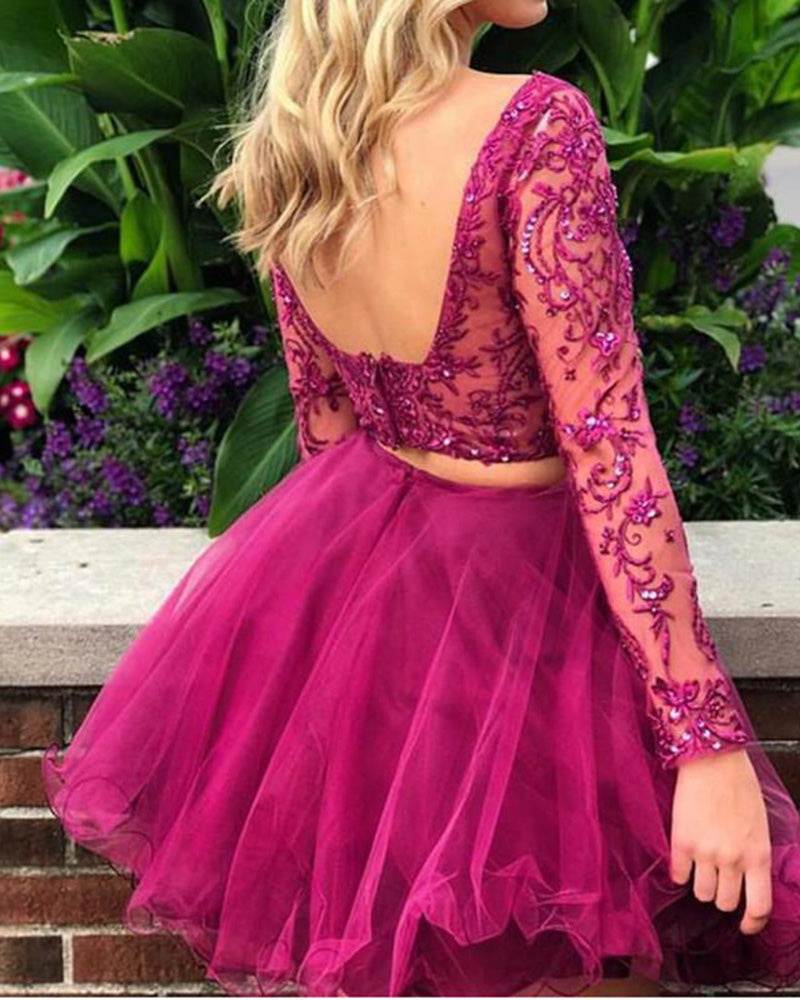 Siaoryne Navy Blue Two Pieces Girls Poofy Lace Short Homecoming Dress with Sleeves SP562