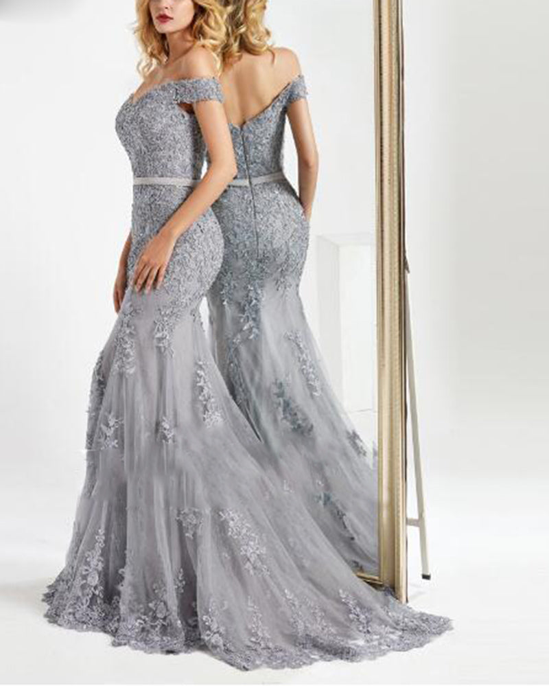 Siaoryne Off Shoulder Gray Mermaid Lace Evening Dress Long Women Prom Gowns PL20143