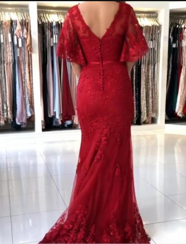 New Design Short Sleeves V neck Lace Red Mermaid Prom Dress PL10251
