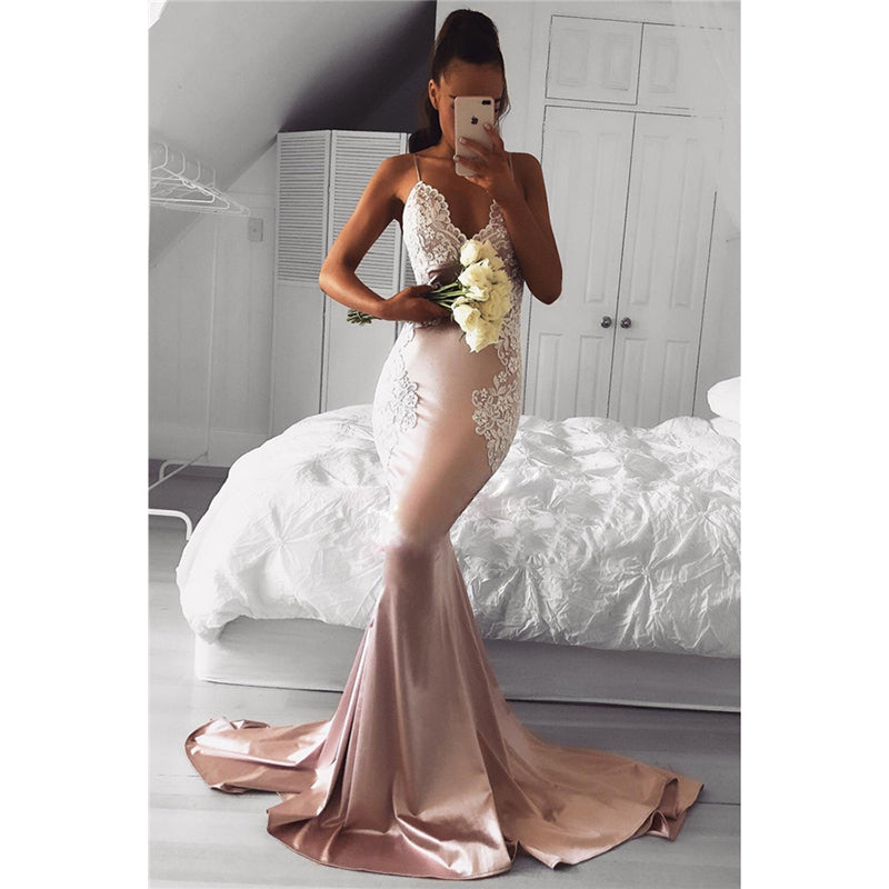 Sexy Backless Rose Pink Satin Mermaid Prom Dress lace Appliqued Formal Evening Dresses with Spaghetti Straps LP1322