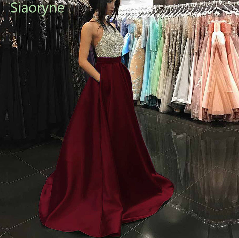 Sexy A Line Rhinestones Prom Dresses Halter Long Halter Satin Beaded Women Formal Evening Dress