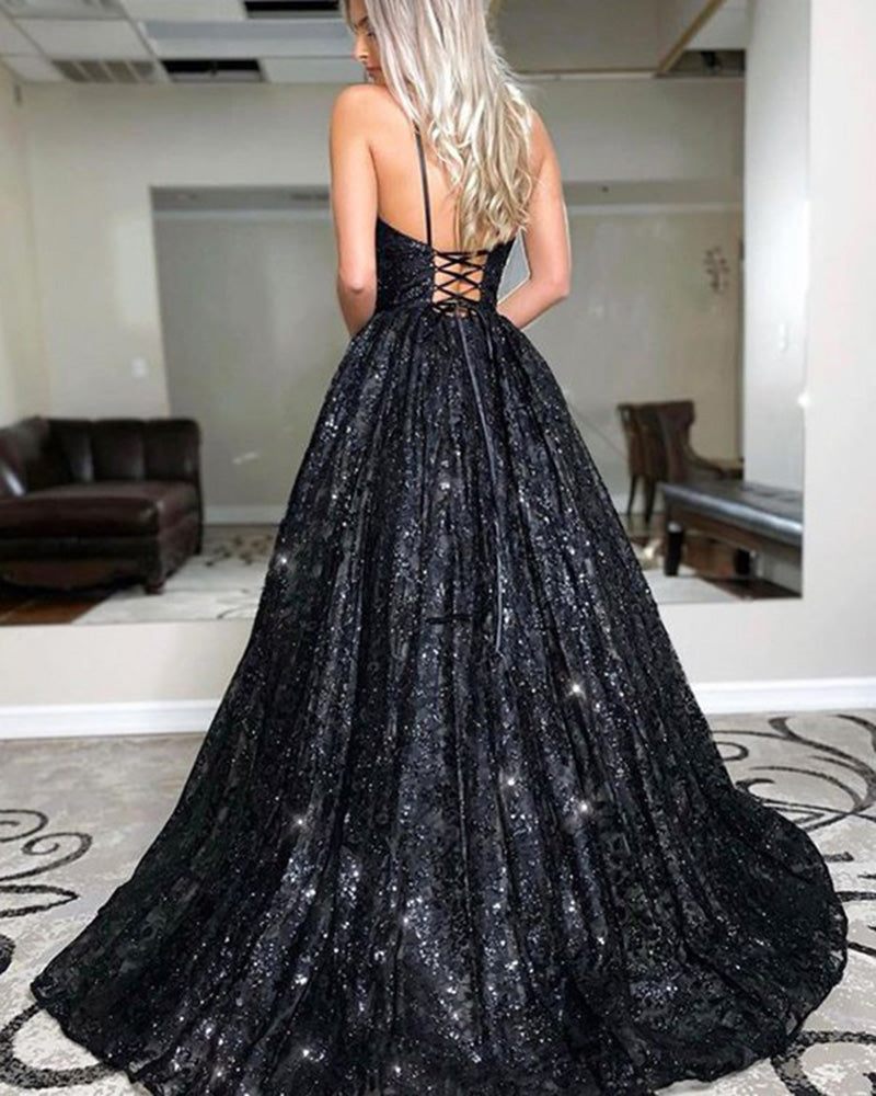 Sexy Backless Spaghetti Straps Black Sequin Long Prom Dress PL2225