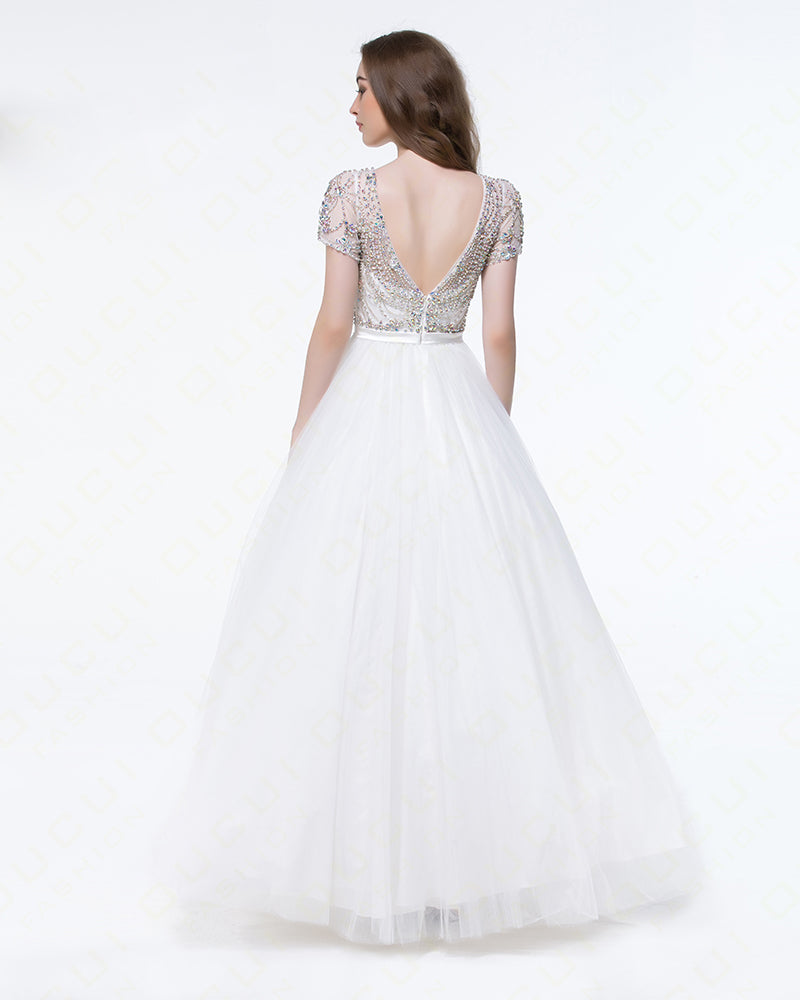 Short Sleeves Girls White Long Graduate Prom Dress with Rhinestones Sweet Party Dress PL0821