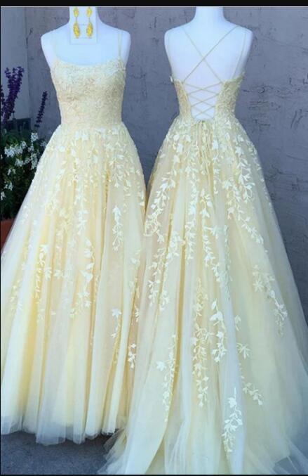 Breathtaking Pale Yellow/Light Blue lace Tulle Girls Formal Gown Prom Dress with lace up tie back