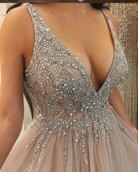 Fashion Champagne Vestido Longo Women Beading Sequins V Neck Evening Party Dress Long