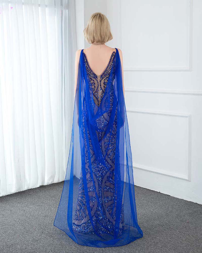 Siaoryne Fabulous Royal Blue Cape Fitted Long Women Evening Gown 2020 with Rhinestone Full Embroidery PL4455