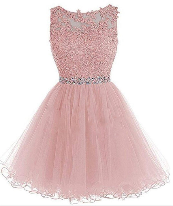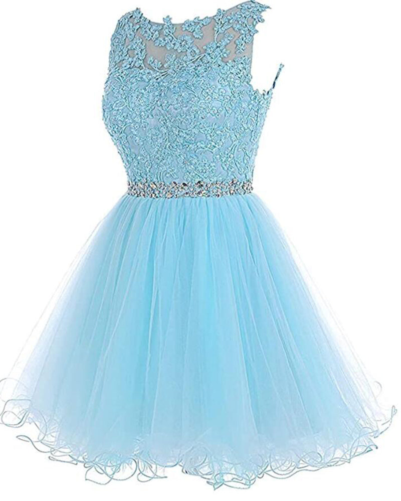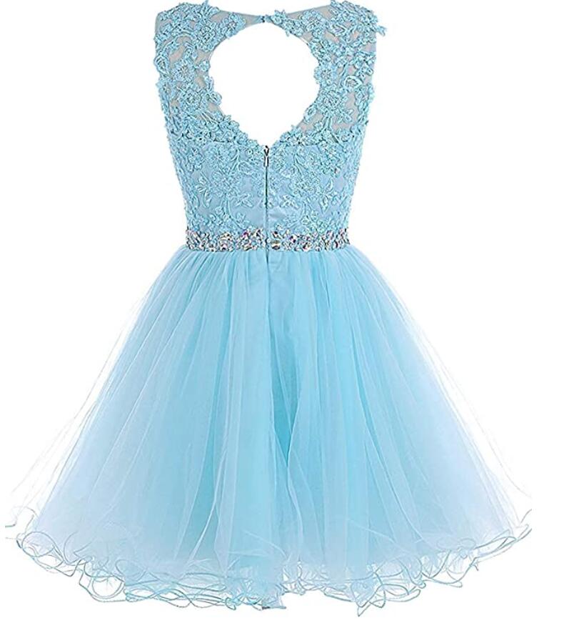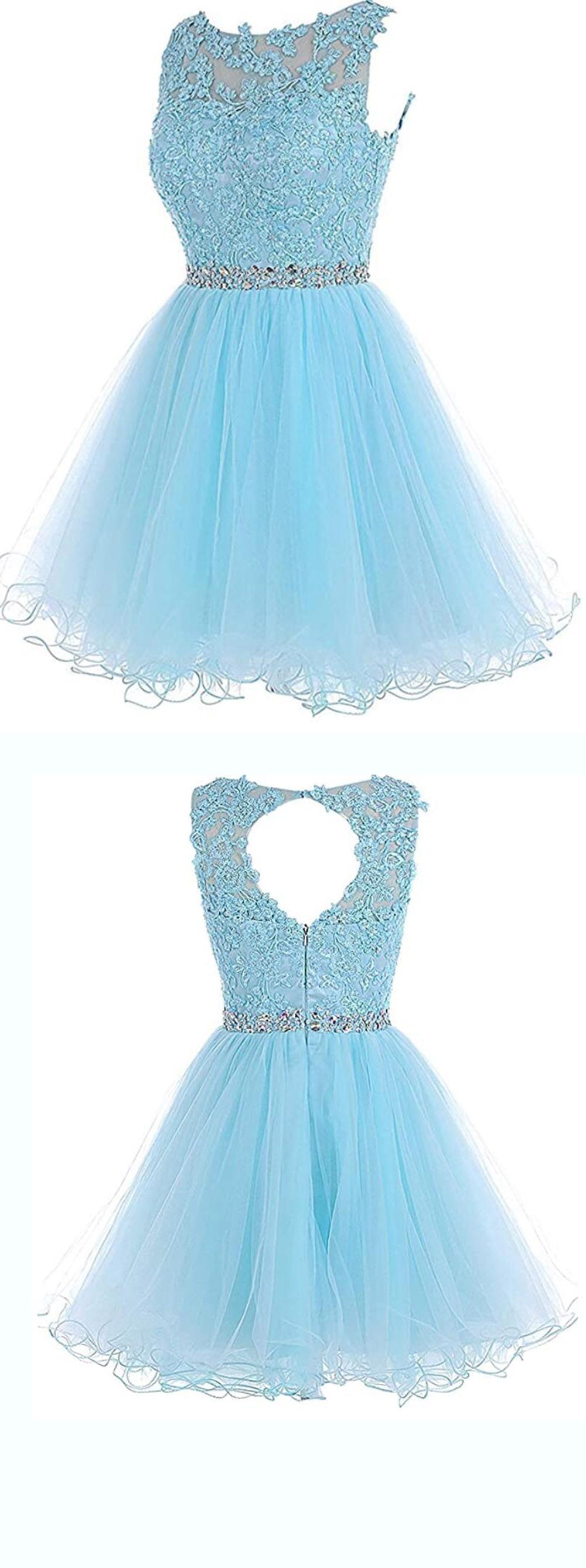 Lovely Sky Blue Lace Puffy Keyhole Back Homecoming Dress Short Prom Dresses with Belt SP10219