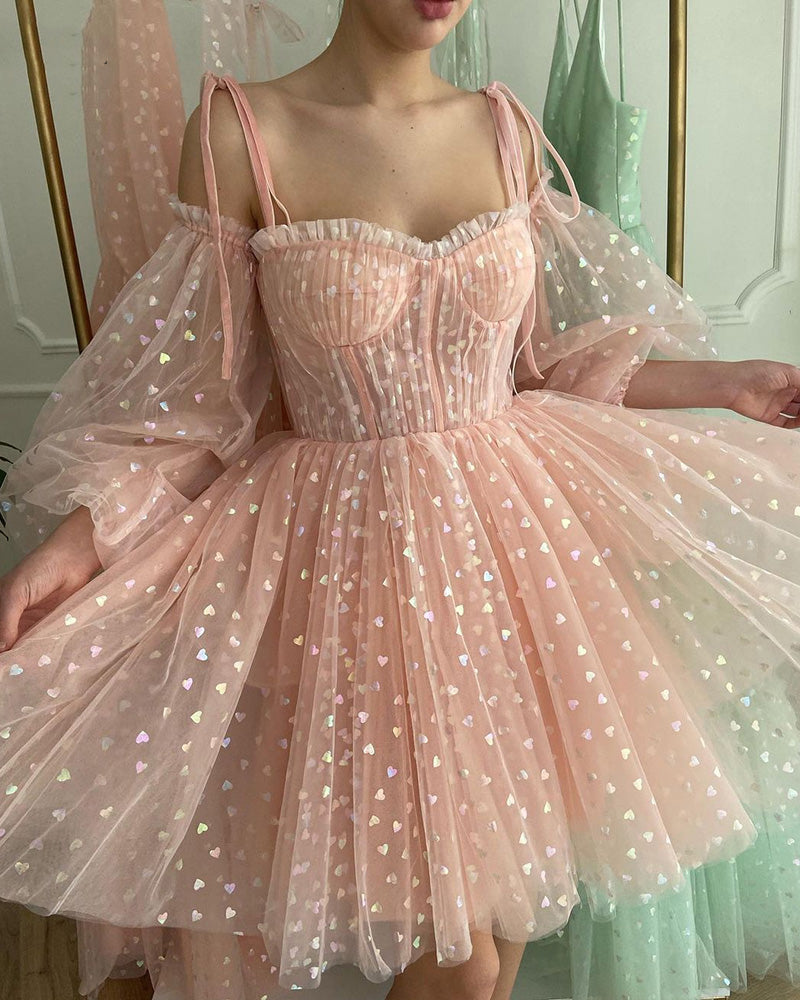 Puff Sleeves Blush Pink Cocktail Party Dresses Tulle Short Prom Gowns Above Knee Length SP105023