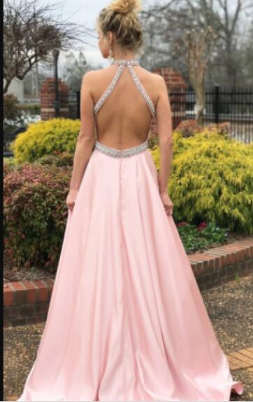 Pink Halter Beading Long A Line Formal Prom Homecoming Dress Girls Evening Party Gown