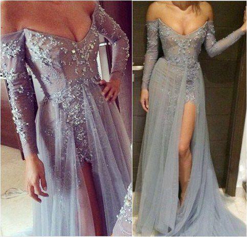 Vestidos de fiesta de encaje con hombros descubiertos y cuentas grises con mangas largas, vestido de noche formal de Dubái 2020