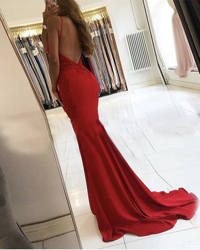 Nuevos conjuntos formales sexys con escote en V 2020 Vestido largo de fiesta de noche de satén con encaje rojo PL0513