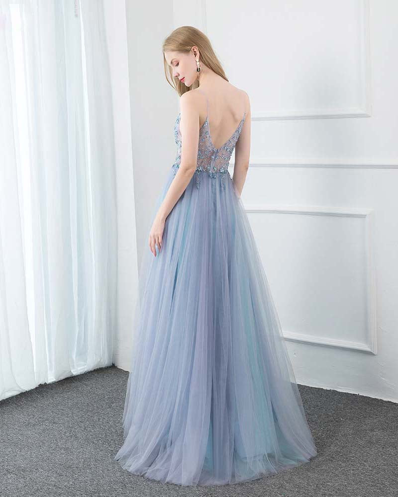 Vestidos de fiesta largos azules con tirantes finos y abertura sexy Vestido de fiesta 2020