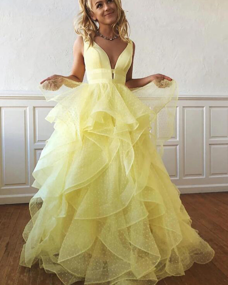 PL5748 Vestido de fiesta largo formal de tul con escote en V pronunciado y lunares para niñas