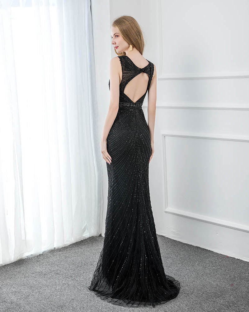 PL2100 Vestido de fiesta de lujo con cuentas negras, vestido de noche largo para fiesta 2020, escote en V sexy