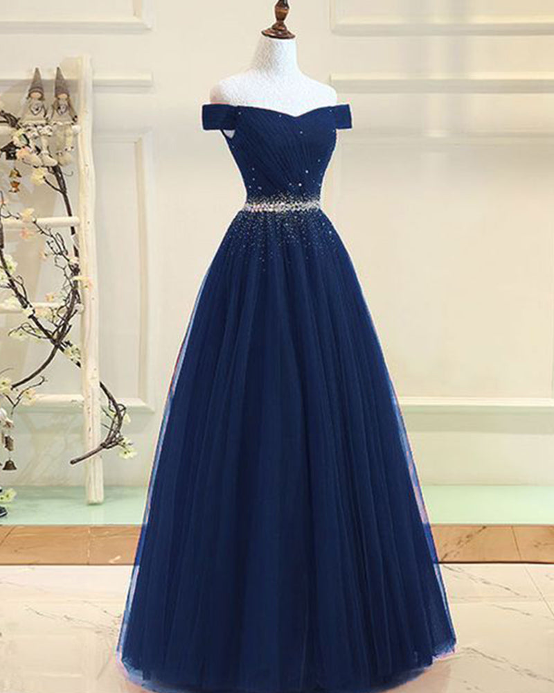 Vestidos de fiesta formales para mujer en azul marino, largos, con cuentas y hombros descubiertos PL5549