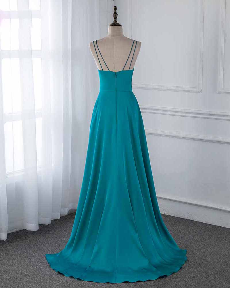 Vestido de fiesta largo con tirantes finos y abertura en color verde azulado PL2058