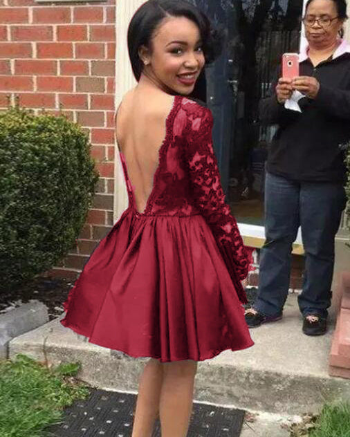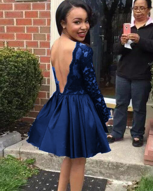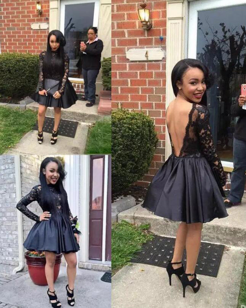 Vestido de fiesta corto africano, negro, corte A, encaje, mangas largas, vestidos de fiesta cortos, ropa de noche