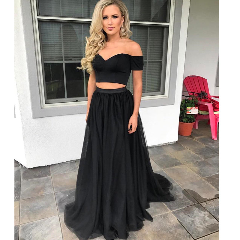 Vestido de fiesta de dos piezas con top corto negro, vestido formal de noche para fiesta, vestido de graduación de corte A