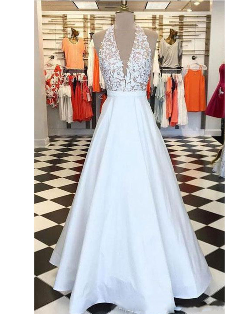 Vestido de fiesta largo de satén y encaje con escote en V en blanco Hlater, vestido formal para fiesta de graduación 2021 PL10911
